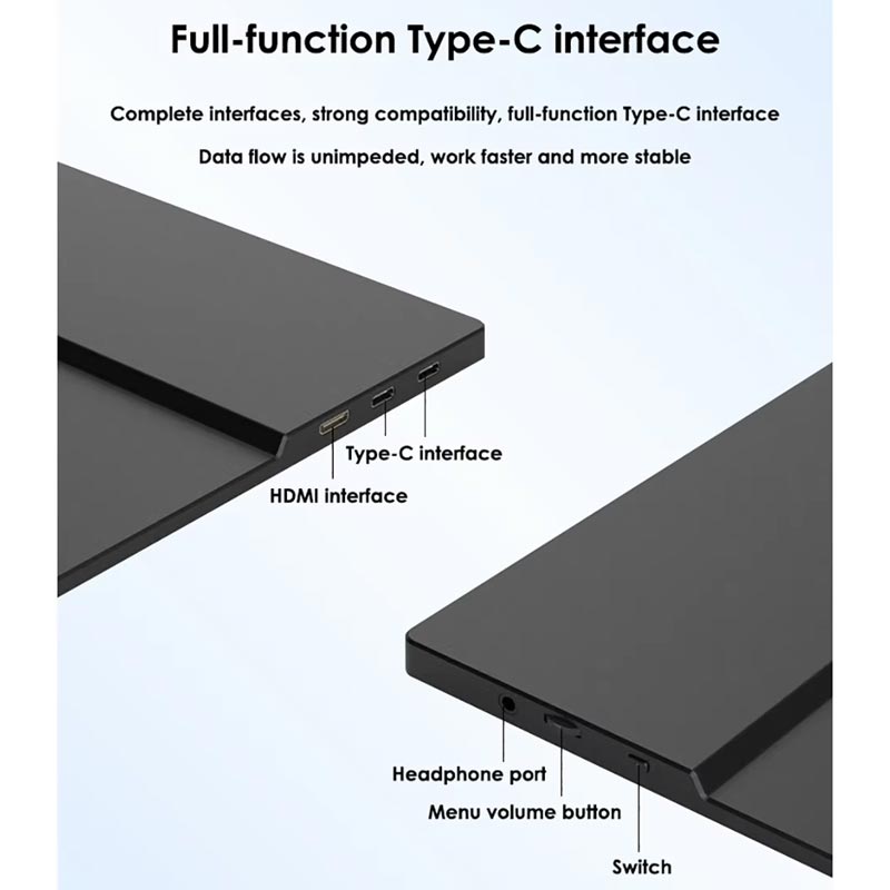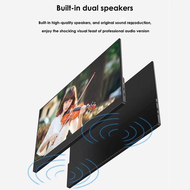Ez a hordozható kijelző beépített kettős hangszóróval van felszerelve, hogy hangot biztosítson további tartozékok nélkül. A csatlakozási lehetőségek közé tartozik a MiniHDMI, a Type-C és a 3,5 mm-es fejhallgató-csatlakozó.
